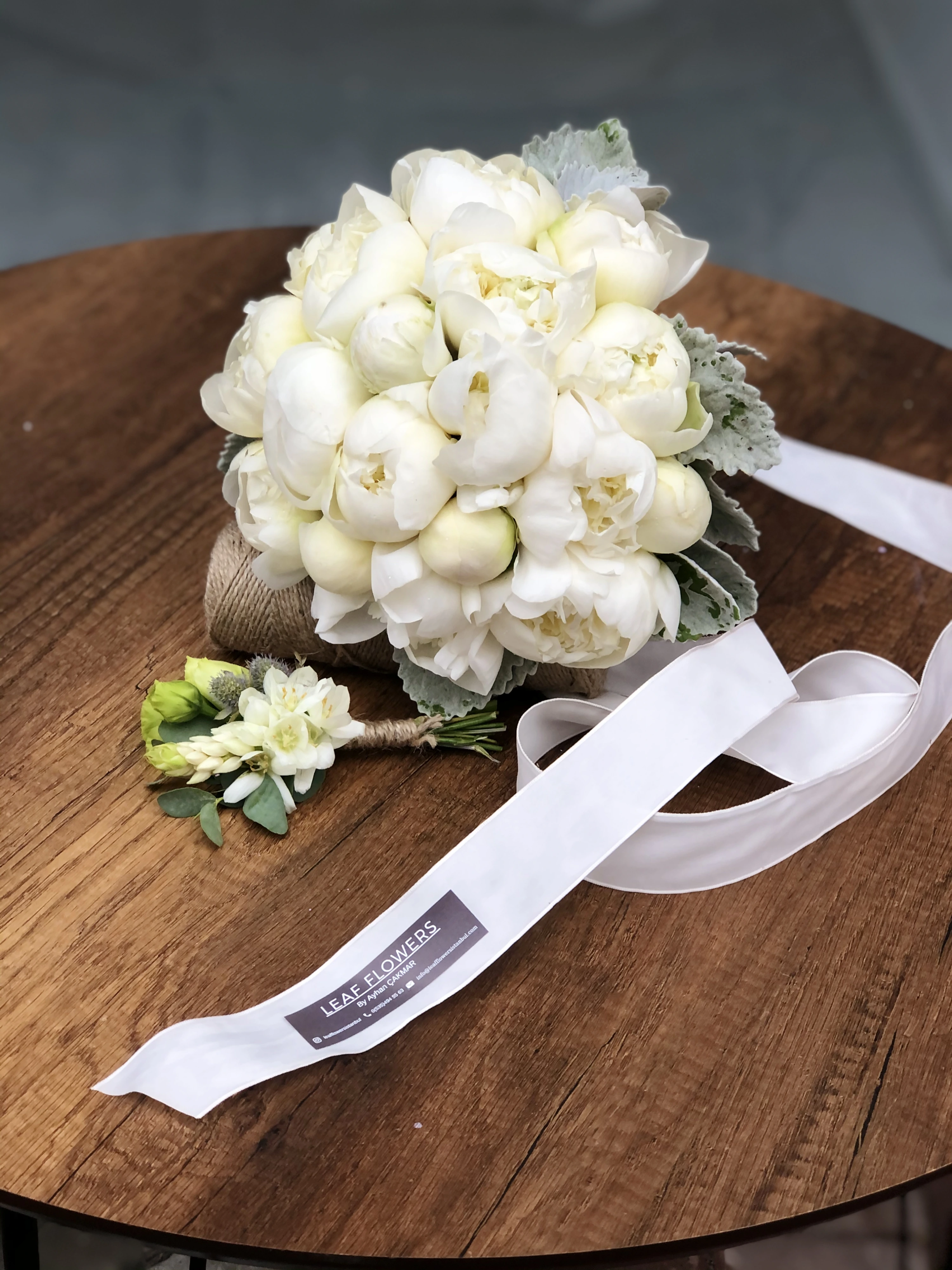Gelin buketimizde gonca beyaz şakayık ve pelin otu kullanılmıştır.