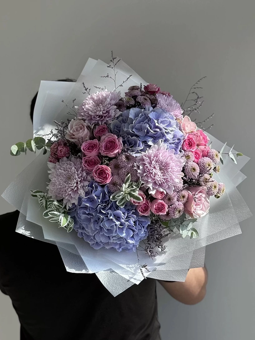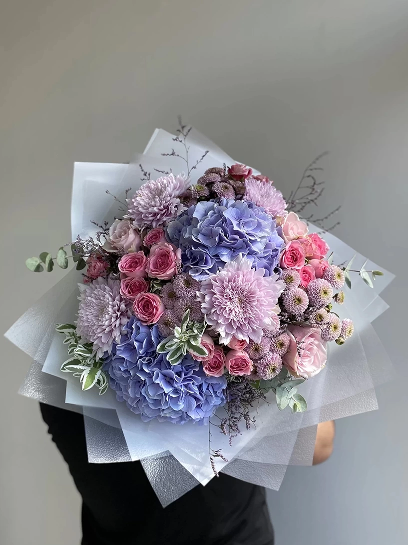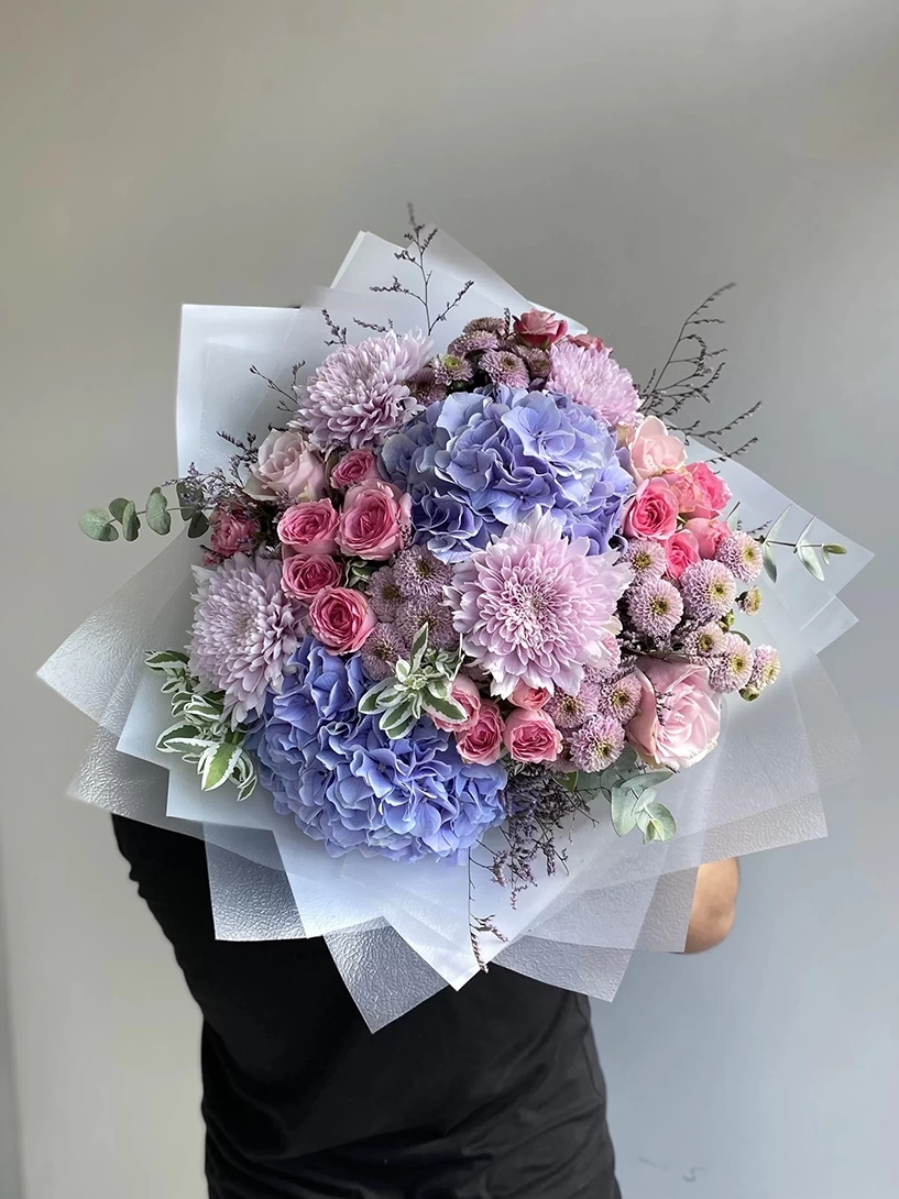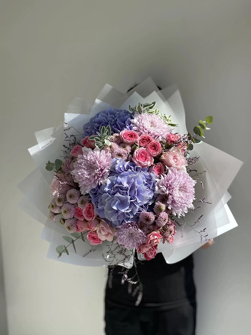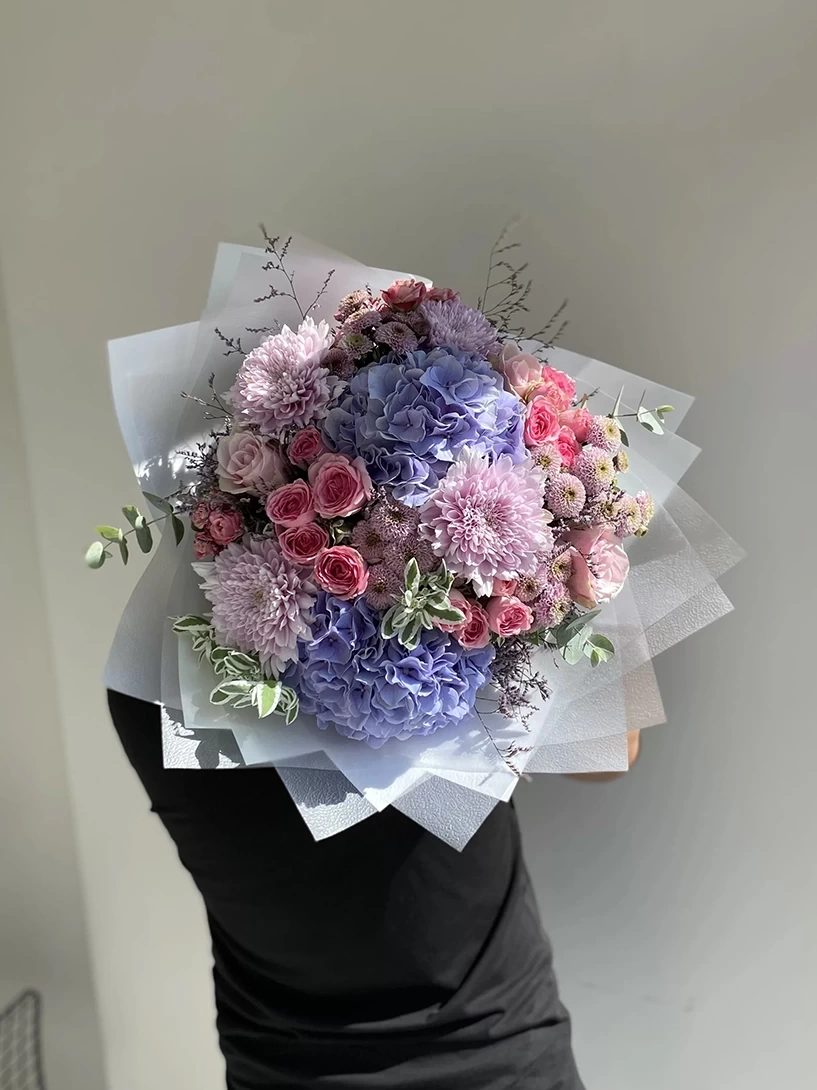 2 من الكوبية الليلكية، 4 من الأناستاسيا الليلكية الفاتحة، 6 من أقحوان السنتيني، 10 سيقان من الورود الوردية الصغيرة، 5 سيقان من الورود الوردية والأوكاليبتوس . تعكس هذه التصميم هواء الربيع المنعش، وتقدم خيارًا هدايا أنيقًا وناعمًا في المناسبات الخاصة.