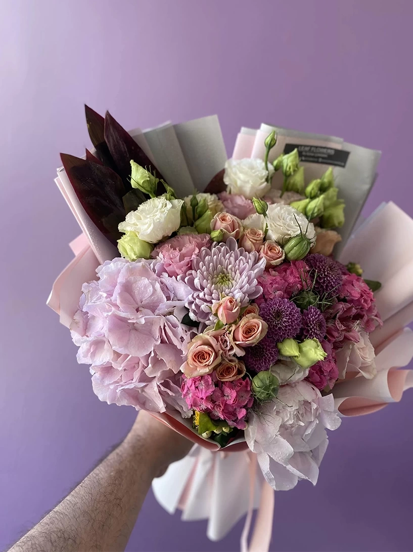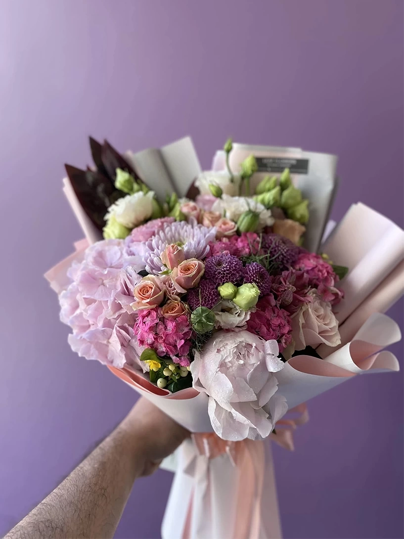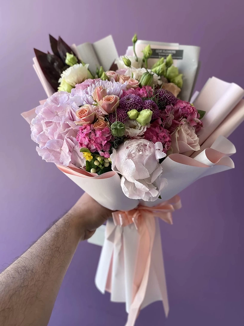 بباقه مختلطه من الفاوانيا والكوبية باللون الوردي، تقدم لمسة أنيقة ورومانسية من خلال جمع تدرجات اللون الوردي المختلفة. تكتمل الهيبة الزهرية للكوبية، ورقة الفاوانيا، والجمال الكلاسيكي للورود مع زهور الليسيانتوس، الأنستازيا، الكريزانثيم، وزهور القرنفل المنثور لإبداع تناغم بصري لافت.