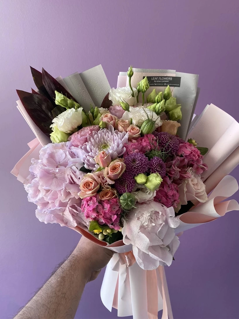 Leaf Flower İstanbul كعادتنا، نختار بحذر الأزهار الأكثر نضارة في الموسم لجميع باقاتنا، بما في ذلك باقة مختلطة من زهور الفاوانيا والكوبية باللون الوردي. بهذه الطريقة تستطيع الباقة البقاء نابضة بالحيوية لفترة طويلة وتضفي أناقة على لحظاتك الخاصة.