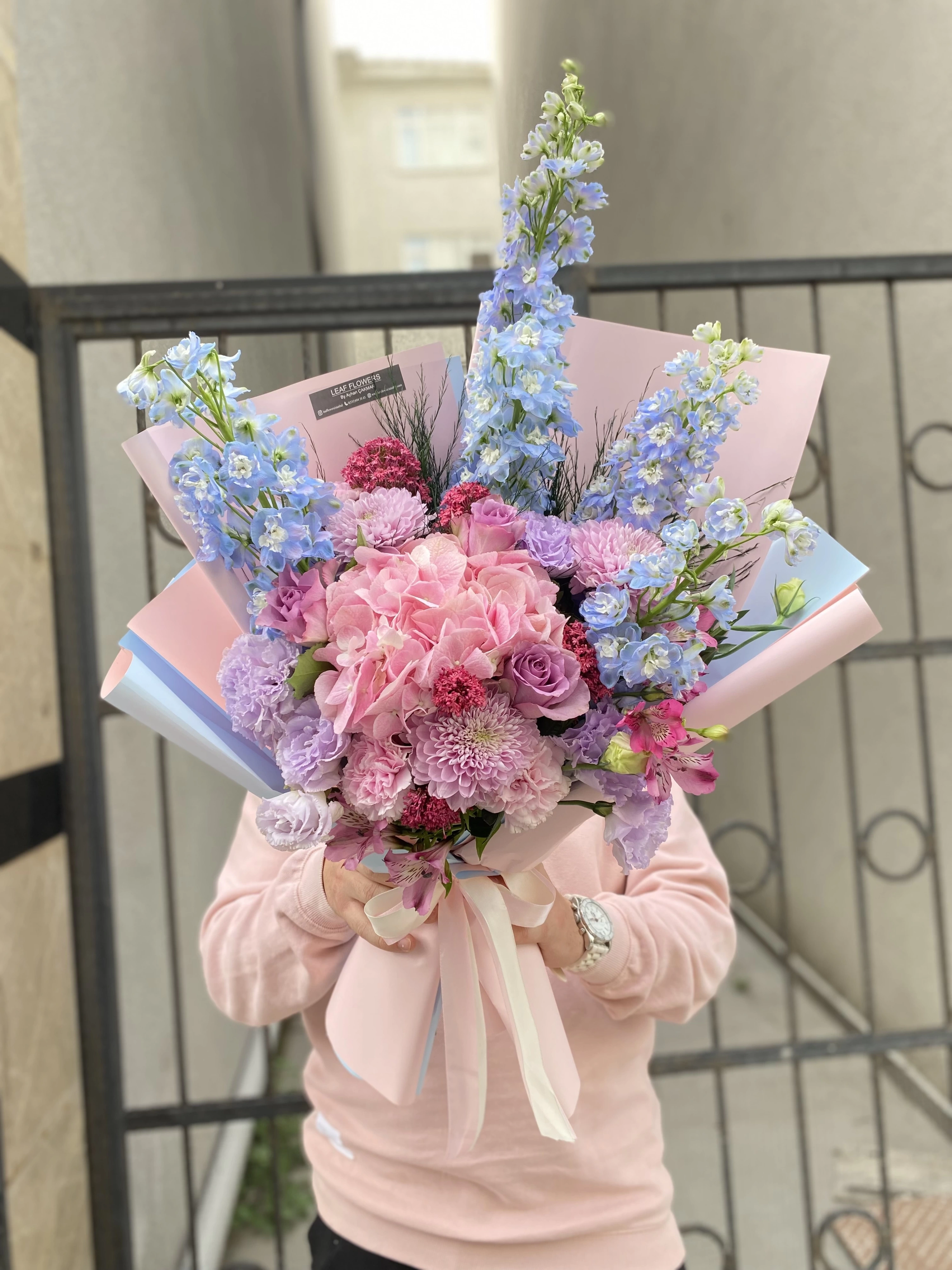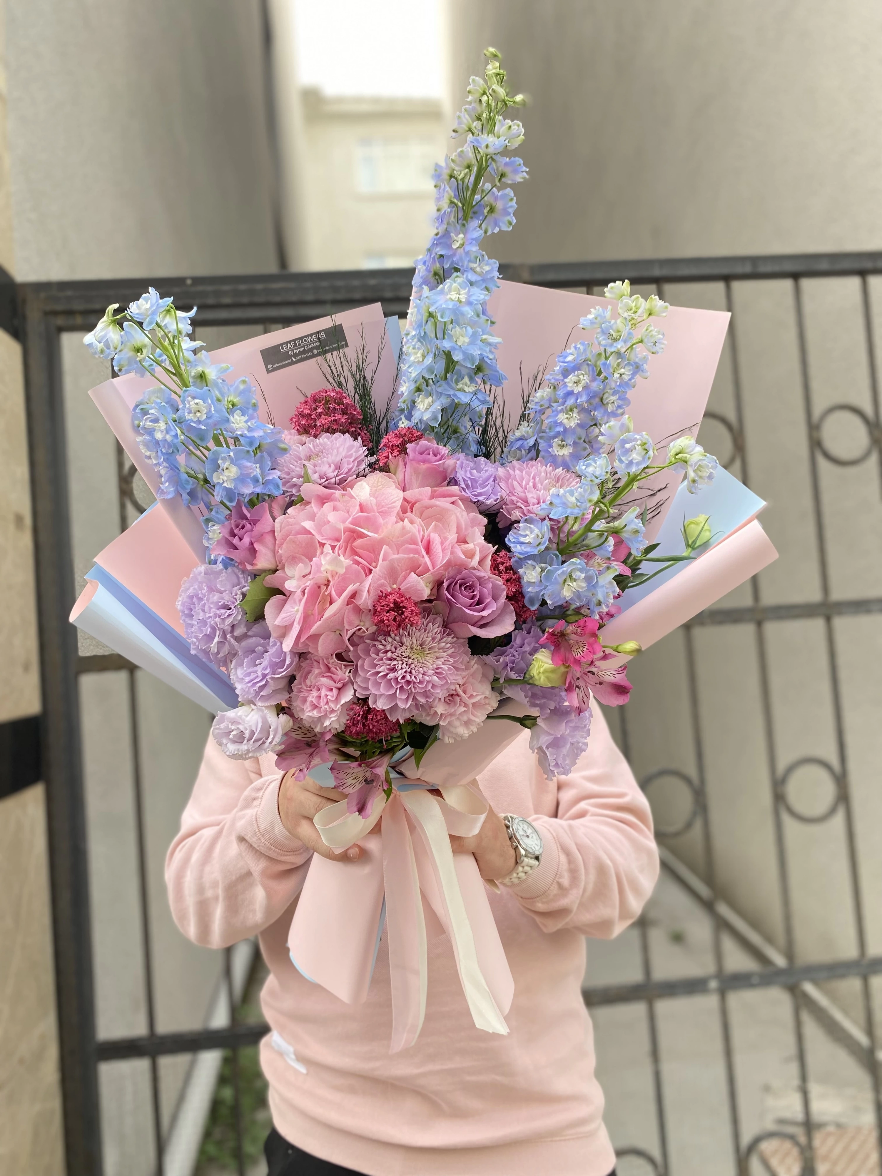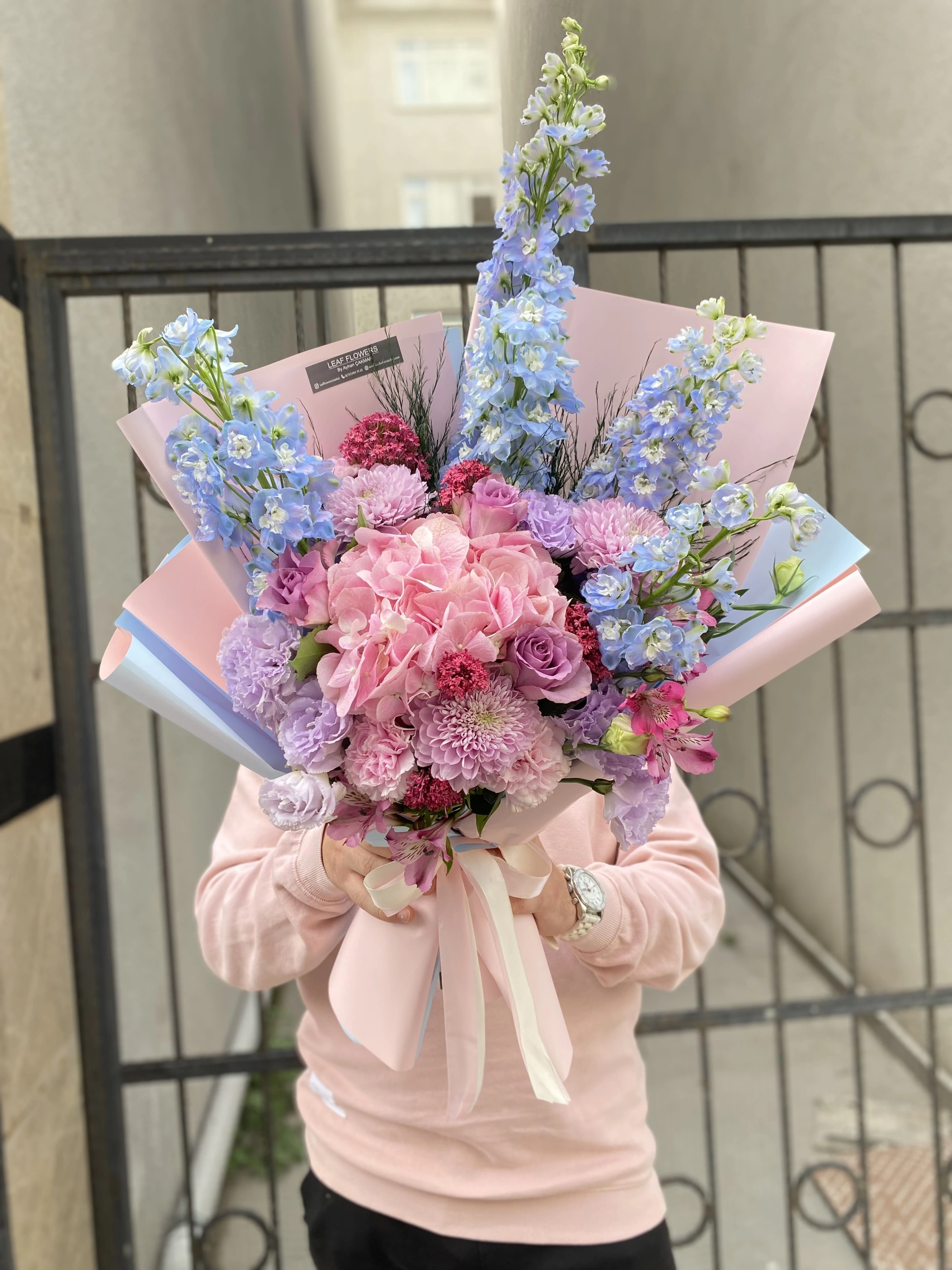 تم استخدام الدلفينيوم الأزرق والأوريجنان الوردي والورد البنفسجي والليلانتس البنفسجي والكرافيك الوردي والأناستازيا الوردية وأوراق البيتا وأوراق اليانوروم.