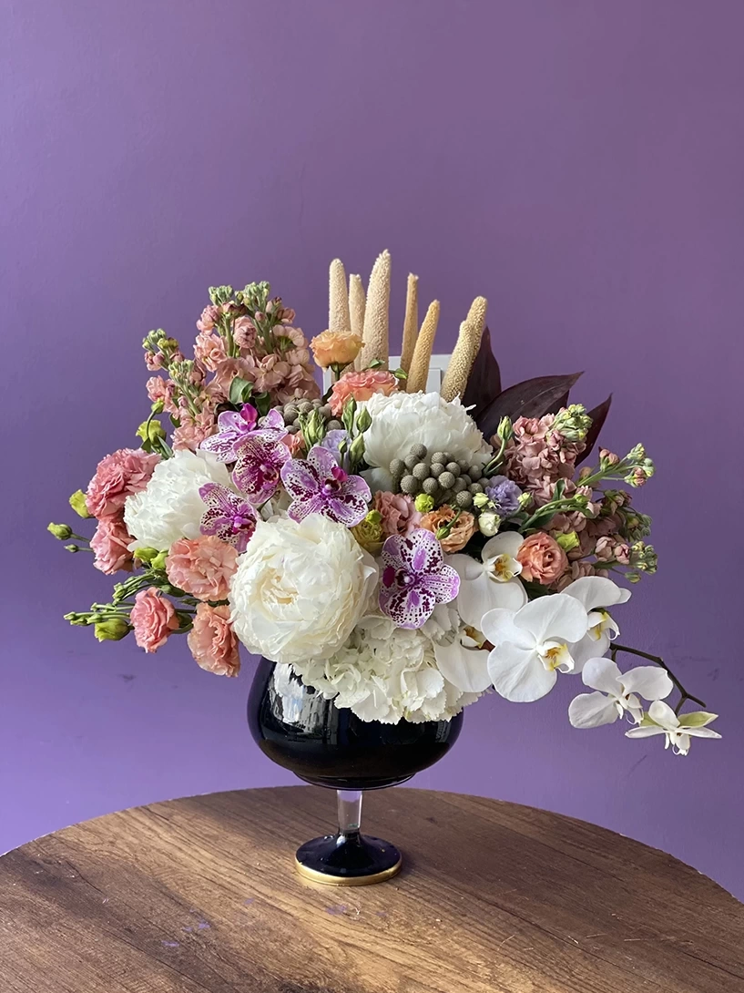 تنسيق كبير بالسلمون الأبيض مع الأوركيد، هو تصميم رائع يجمع بين الألوان الأنيقة والورود النبيلة. يتميز بنقاء الفاوانيا البيضاء والكوبية، ودفء ألوان السلمون، وعظمة الأوركيد، مما يجعل هذا التنسيق فريداً من نوعه. الزهور المتوازنة بالألوان البنفسجية والكريمية تكملها الخضراوات لتقدم بديلاً لا يُنسى للهدايا في المناسبات الخاصة.