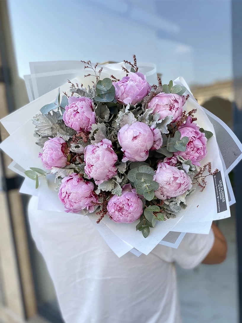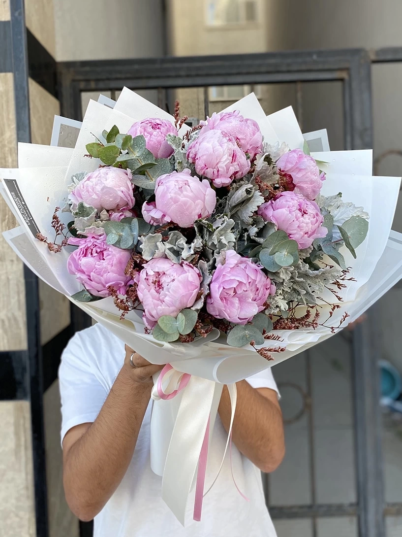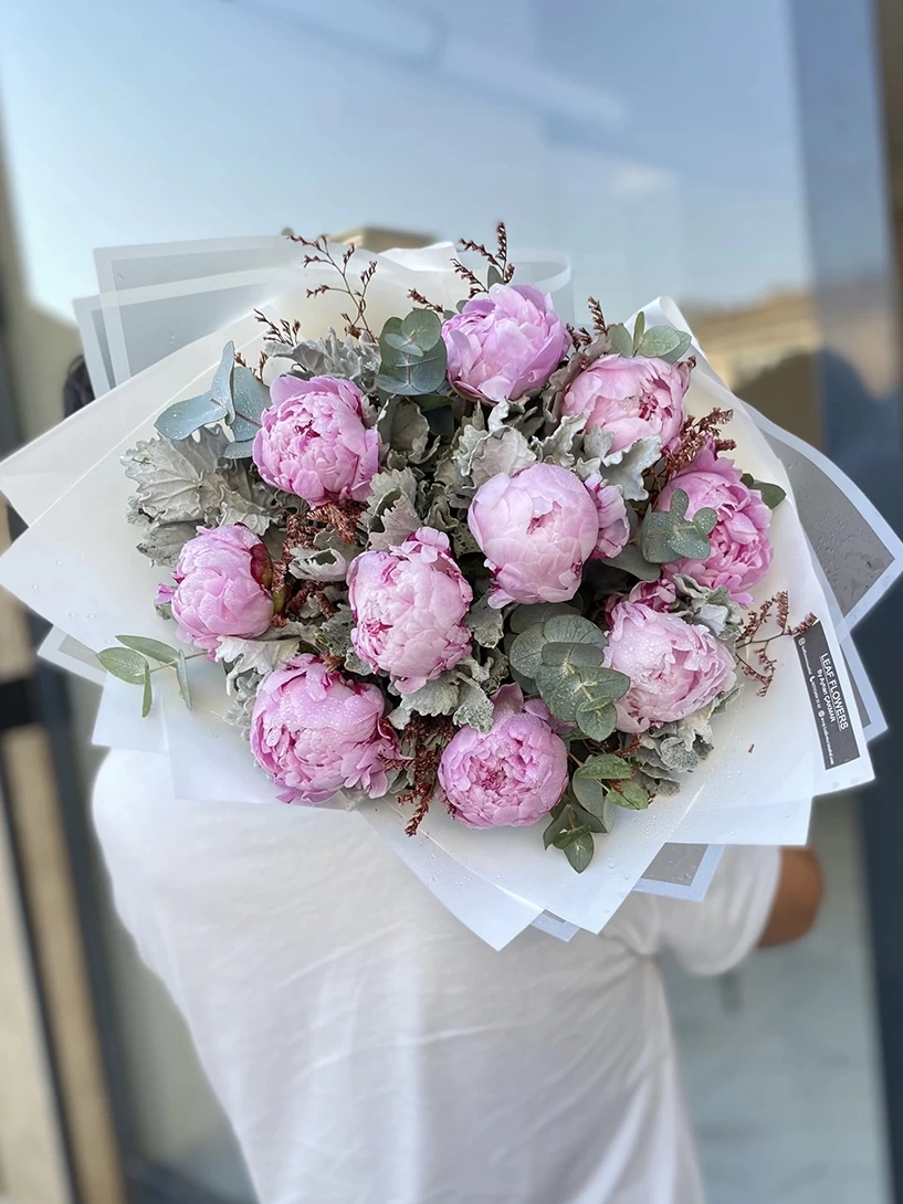 Buketimizide 10 pembe şakayık limonyum pelin uaprağı okaliptus ve yan ürünler kullanılmıştır